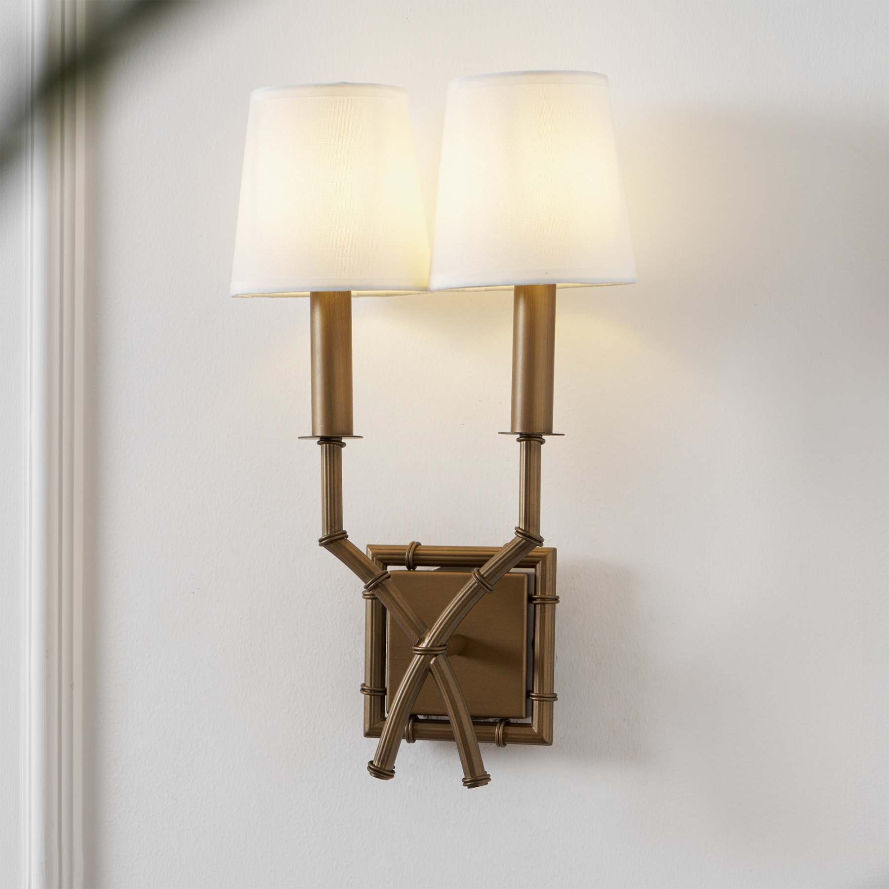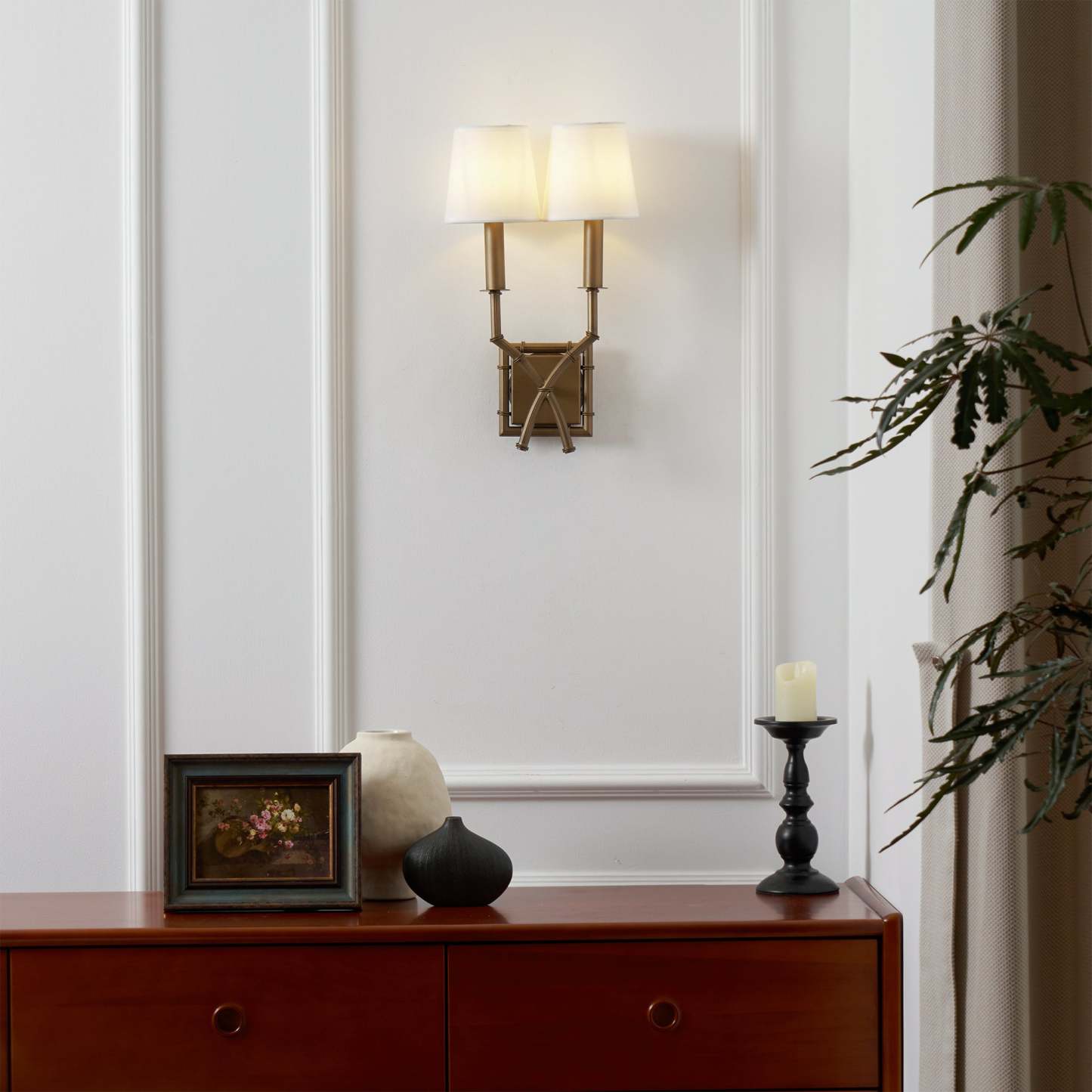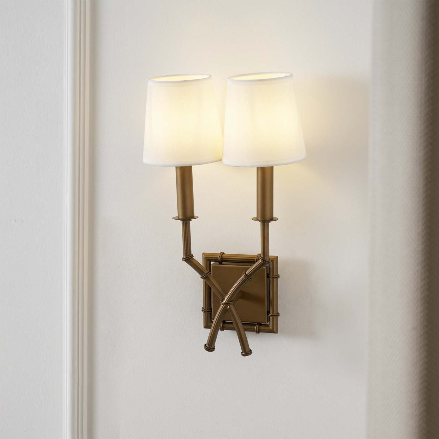 We love wall sconces for creating warm ambient light in any space. from the living room and dining room to the bedroom. Our Double Arm Bamboo Sconce is handmade of glowing antique brass with bamboo-style turnings. We completed the global look with our White Tall Linen Chandelier Shades.