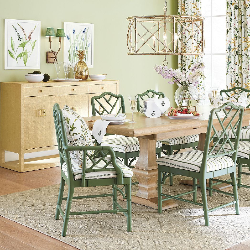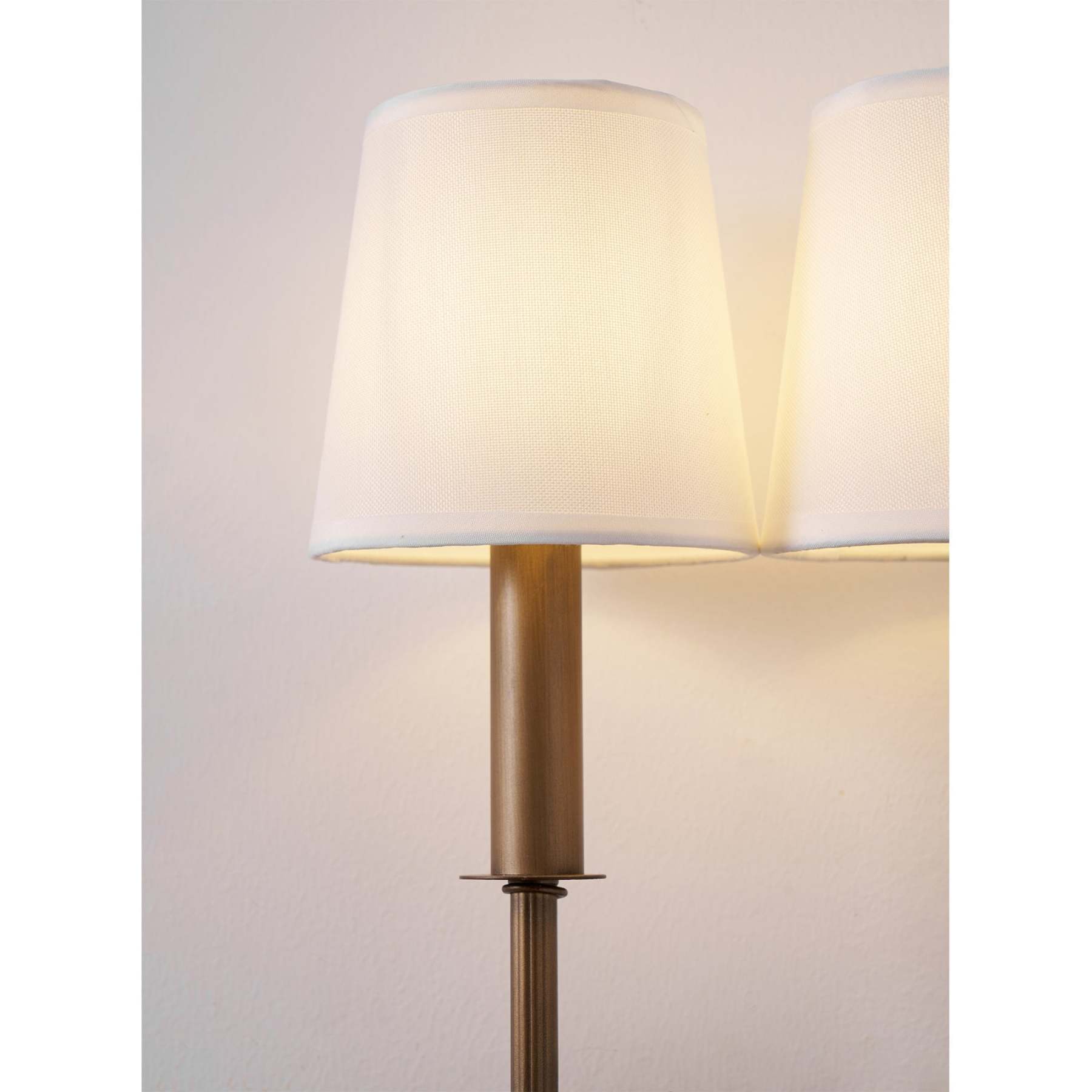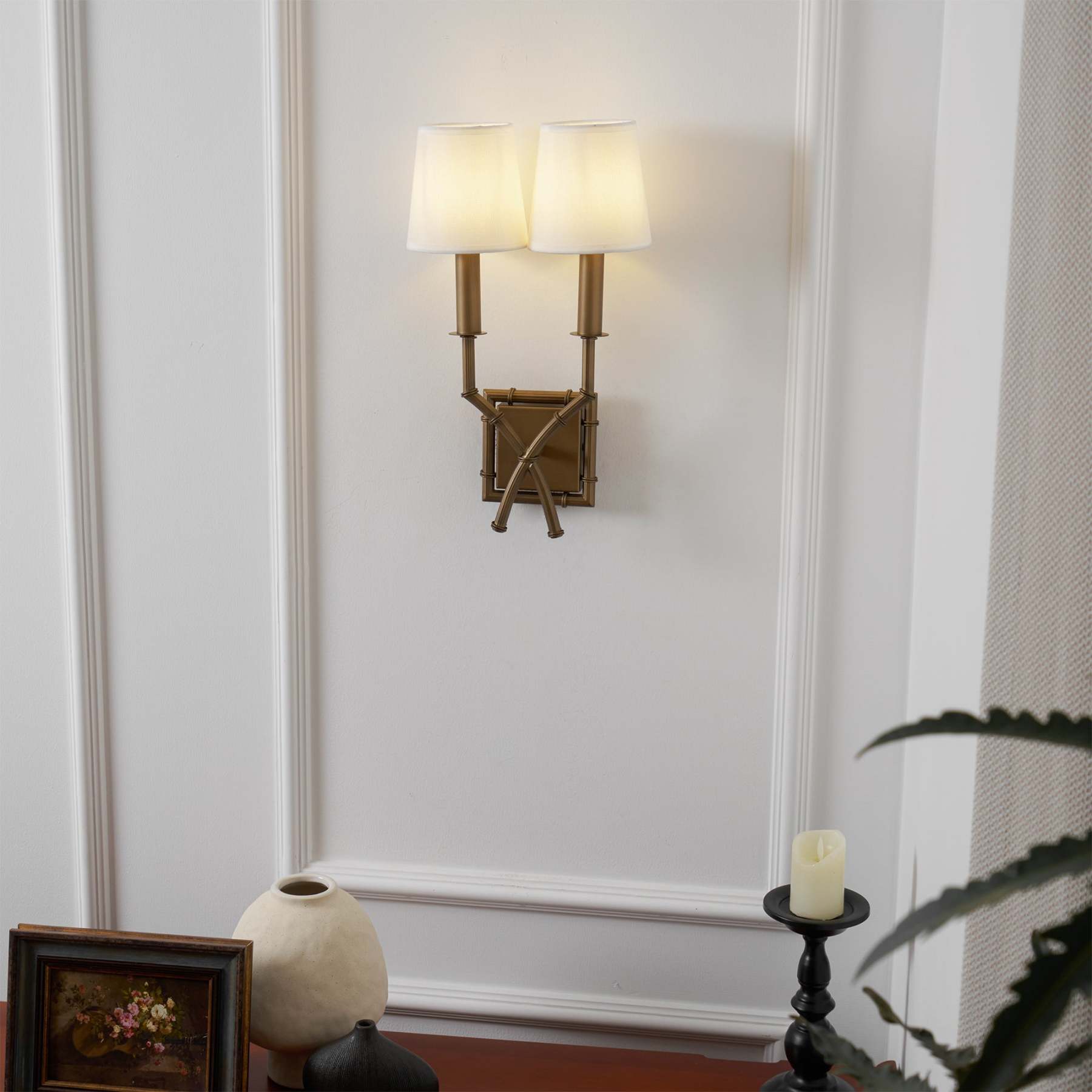 We love wall sconces for creating warm ambient light in any space. from the living room and dining room to the bedroom. Our Double Arm Bamboo Sconce is handmade of glowing antique brass with bamboo-style turnings. We completed the global look with our White Tall Linen Chandelier Shades.