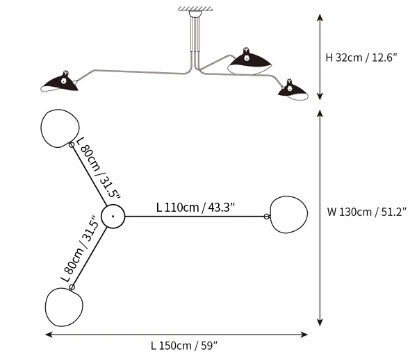 Ceiling canopy plate size: Dia 12cm x H 7cm / ∅ 4.7″ x H 2.8″